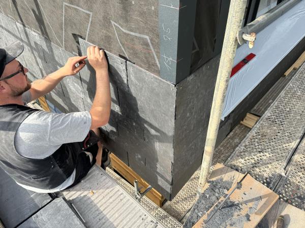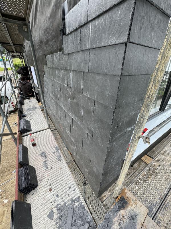 Wir nahmen die handwerkliche Herausforderung selbstbewusst an und erlernten mit großem Vergnügen die Techniken der Schieferverarbeitung. Dieses Projekt hat uns nicht nur fachlich bereichert, sondern auch gezeigt, wie inspirierend es ist, traditionelle Materialien in moderne Architektur zu integrieren. Auch dieses Projekt wird als Referenz bei Rathscheck geführt.