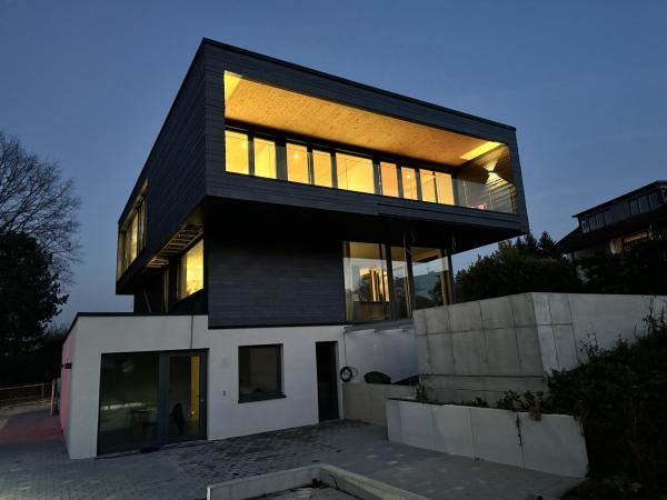 Über den Dächern von Kuppenheim, mit Blick auf die Vogesen und den Pfälzer Wald, entstand der Flying Cube. Völlig losgelöst schwebt das zweite Obergeschoss über der Leichtigkeit des ersten. Statisch anspruchsvoll zeigt dieser Bau eindrucksvoll, wozu die für Westermann Holzbau typische filigrane Bauweise fähig ist.